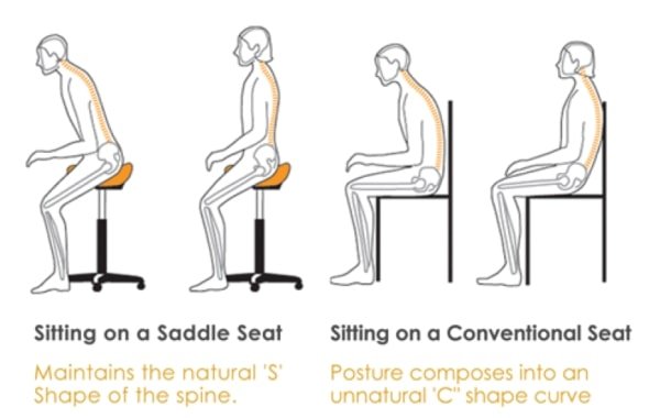It has been clinically proven that the use of a split saddle stool is able to build muscle as the stool forces the user to sit up straight thus building both your upper leg, buttocks, abdominal and leg muscles. The proper way to sit in a saddle stool is at a 135 degree angle with your legs spread out in a way called hip abduction to stabilize the pelvis in an upright orientation. This sitting stance helps to improve balance, hand acuity and strength over time. However, the user typically sits in a higher position and must adjust its work surface to a higher height as well.