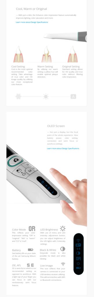 This High Definition Camera (1280 x720) features the most state of the art technology in intraoral cameras today. The camera is available in both wired and wireless options as well. The wireless option uses a high speed digital wireless signal that produces a perfect clear, lag free and interference free image. The wired option uses a USB 2.0 connection direct to the computer for easy plug and play operation.