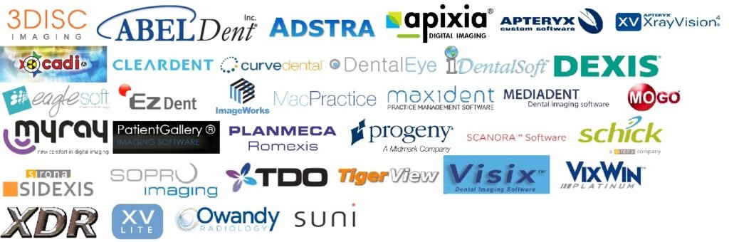 Abeldent, Apertryx, Maxident, Eaglesoft, Vixwin, Curve Dental, Apixia, Schick, Tigerview, MediaDent, Dexis, Planmeca, Romexis, Cadi, DentalEye, Imageworks, Adstra, Myray, Patient Gallery, Progeny, MOGO, Scanora, Sirona, Dentalsoft, Cleardent, TDO, 3Disc Imaging, Sopro Imaging, MacPractice, XDR, Visix, EZDent, XVLite, Owandy Quickvision, Suni Imaging.