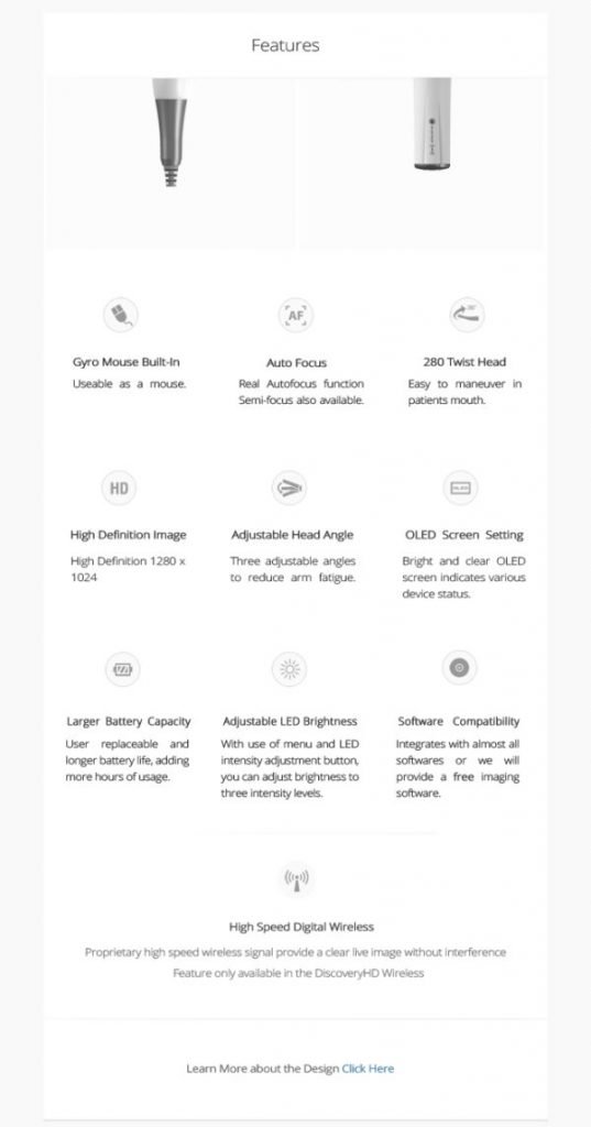 Gyro Mouse Built-in: The built-in gyro mouse is a unique feature only found on the Whicam Story 3 intraoral Camera. It allows the user the integrated pad on the camera like a mouse feature. This feature allows the user to easily and readily control the mouse and manipulate the images without having to reach for their mouse. It also acts as a great tool for education when showing the images to a patient.